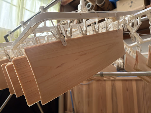 反りの強い単板はこのように直前まで帯留めしておき、反りを軽減させてから次の糊付け工程に移ります。